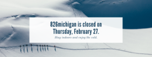 826michigan is closed on Thursday, February 27 February 27, 2020 | 826 Blog Post All 826michigan buildings and programs are closed due to inclement weather on Thursday, February 27, 2020.