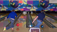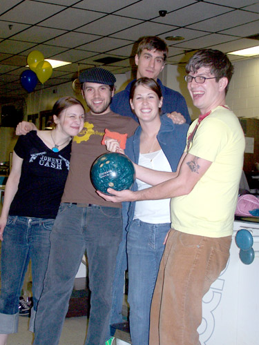 Interns Ryan and Luke square off in a bowling duel. Or, judging by Ryan’s jazz hand, perhaps they’re about to break into song. Is there a musical yet about bowling?