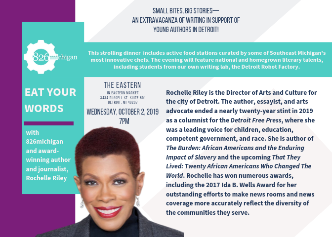 Hosted inside The Eastern, a fabulous event gallery in Eastern Market, this strolling dinner of small bites and big stories includes active food stations curated by some of Detroit’s most innovative chefs. Don’t miss the opportunity to enjoy small plates and sweet treats from Wright and Company, Chartreuse Kitchen and Cocktails,Table No. 2, Republic Tavern, and Good Cakes and Bakes, all under one roof! The evening will feature national and homegrown literary talents, including student authors from our very own writing lab, the Detroit Robot Factory. We will end the night with an interactive paddle raise, which will generate funds for FREE writing programs that support Detroit students. Hope to see you there!