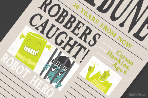 Twenty years from now I will be twenty-six. I will be a robot. I’m going to be fighting robbers and evil. I will live in the Detroit Robot Factory. I will live with Ennis, my best friend robot.