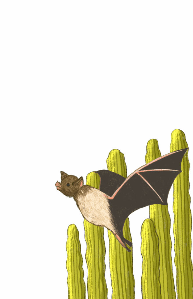 This was the nighttime. And there was a lesser long-nosed bat who could fly 120,000 miles in one night. And he could run ∞ miles in his life. This was how much he loved nectar! He drank nectar from the flower of the organ pipe cactus, which he helped to pollinate. The more nectar he drank, the more flowers grew on the organ pipe cactus, and that made him big and strong.