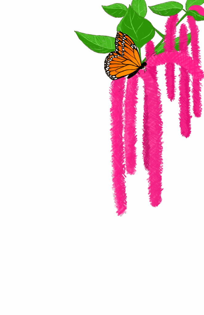 And there was a chenille plant. It was pink—dark pink—and it was soft, cuddly, and cozy, like a squishmellow. The chenille plant had a butterfly on its leaf. The butterfly felt warm. The chenille plant ate Chenille-Os and chenille ice cream, and watched a chenille show. It was funny. The chenille plant’s neighbor ate their bananas because they were banana plants.