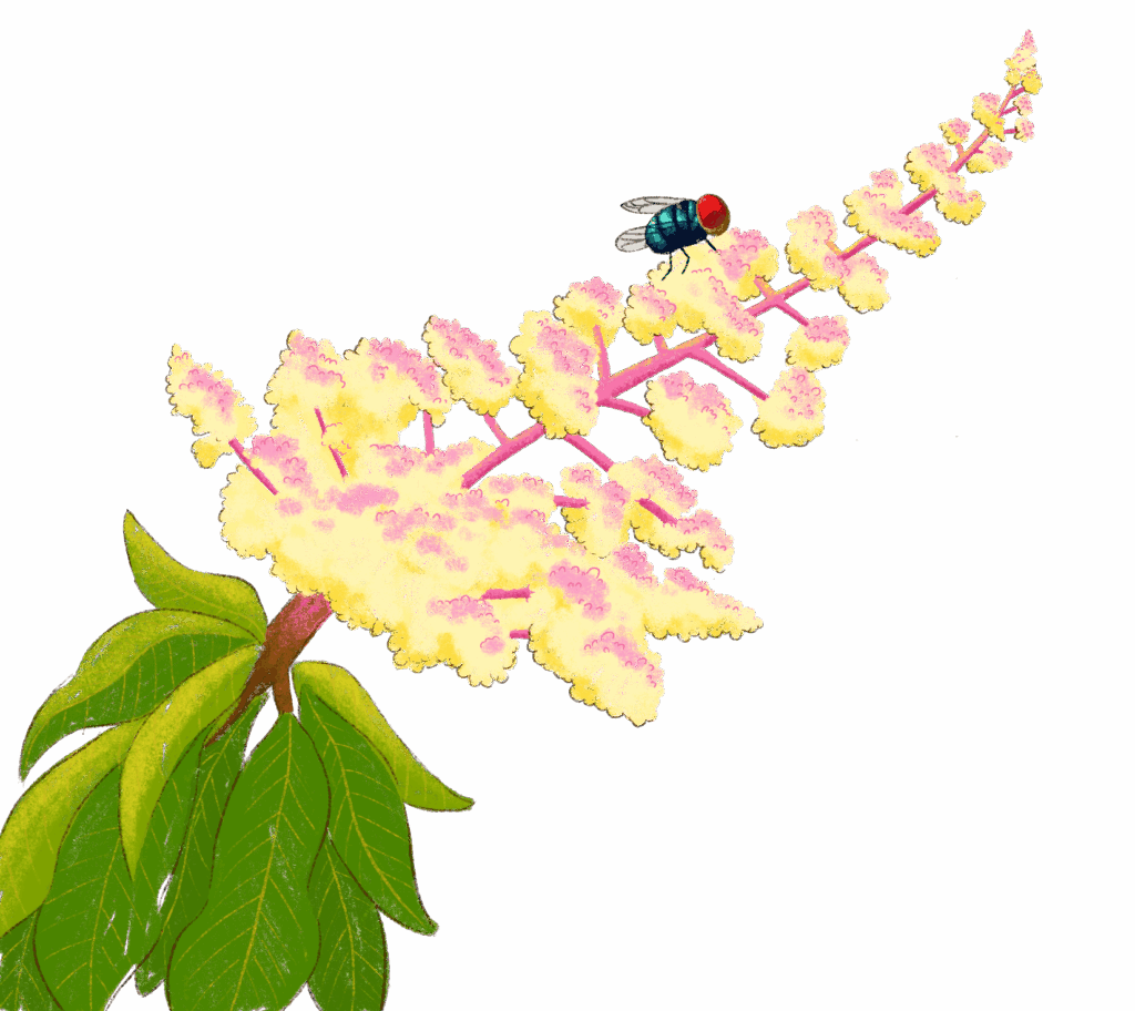 The blue bottle fly brought pollen back to his family, his brothers, his mother, and his dad. So they could all help pollinate the mango tree.