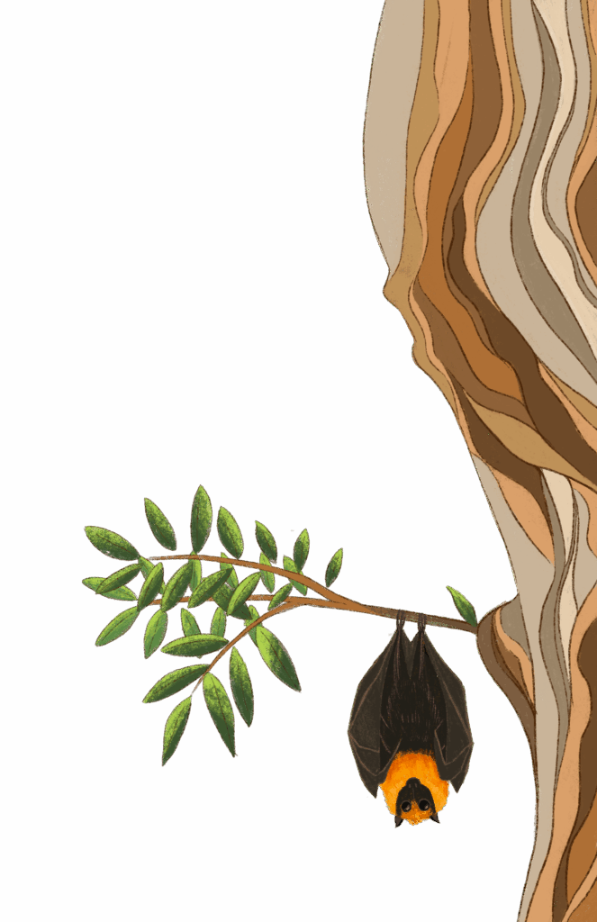 It was 7:30 p.m. I’d just woken up. I am nocturnal and I am a fruit bat. My name is Avery Jr. I have a big family and lots of friends, including Jimmy 1 and Jimmy 2. We live inside of a conservatory in the middle of the jungle. There are flowers on the ground and flowers that grow upside down, just like us. There is a fire to keep us warm and golden locks around the fire so it doesn’t spread. I have the best eyesight out of any bat, and I am also the largest bat. I am as big as a school bus! Sometimes, I am called a mega bat.