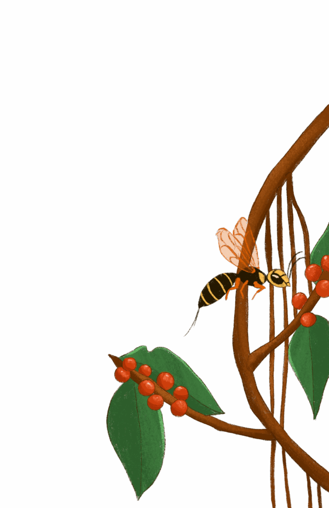 It was a fig wasp. It had four wings. And then another fig wasp showed up and said, “Whoever dances the best gets the last fig!” So they danced the Blueberry Dance. And they danced the Strawberry Dance. They danced in a place that smelled like rain and waterfalls. And everywhere they could see trees and little bunnies. They did a move called “The Buzz.” And then they smelled like sweat. So they needed fresh air.