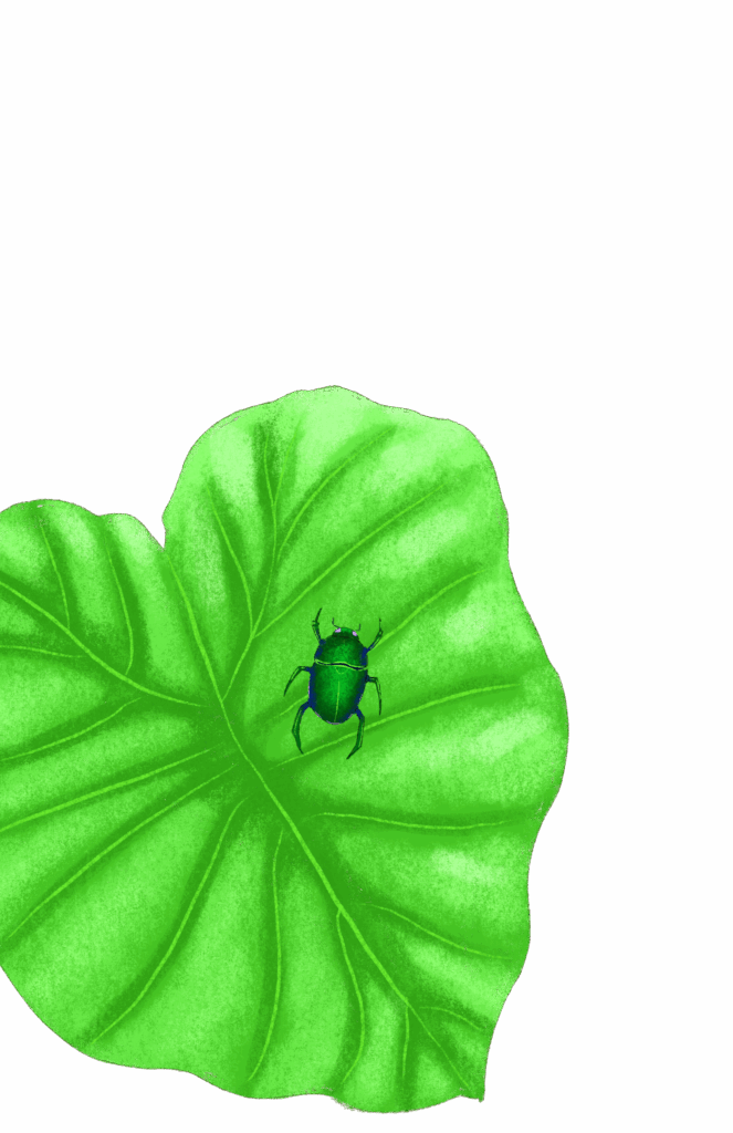 We met two new scarab beetle friends, Flamingo and Lion Boy. We saw an elephant ear that was as giant as a skyscraper. We started munching. It was chewy like a raincoat and got stuck in our teeth.
