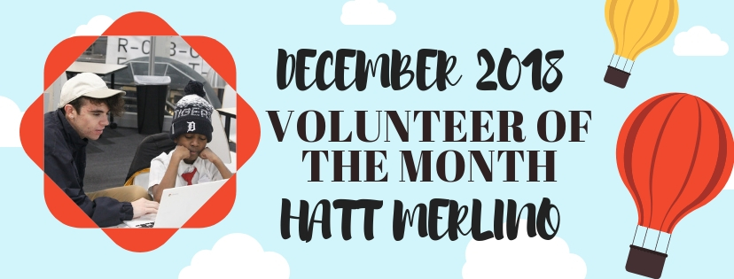 Hatt Merlino has been such a welcome part of the Detroit After-School Tutoring volunteer roster. Their calm demeanor has helped set such a good tone in our tutoring space in Detroit this year. They have a unique way of engaging students in a warm and attentive way, with a sensitivity for encouraging students to complete one more math problem and also for when it’s just time to take a break and relax with a book, writing activity, or snack. You can often find Hatt writing or joking right along with the students they are working with and can often hear their laughter clearly above the tutoring lab noise. If you listen closely, you may even overhear a question to help students process through their own thinking and feelings.
