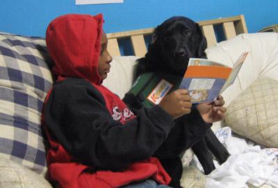 About two and a half years ago, we met with Joan Doughty, the woman who runs CAN. After an invigorating conversation, and a summer’s worth of writing workshops, we came up with an idea that, a few months later, turned into our cutest-ever program. Once a week, we bring Colby, a trained service dog, to the center, and the students there read to her. We’ve told you about it a lot over the last few years, so we’ll just remind you with this picture: