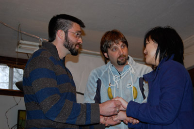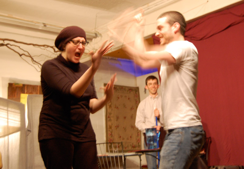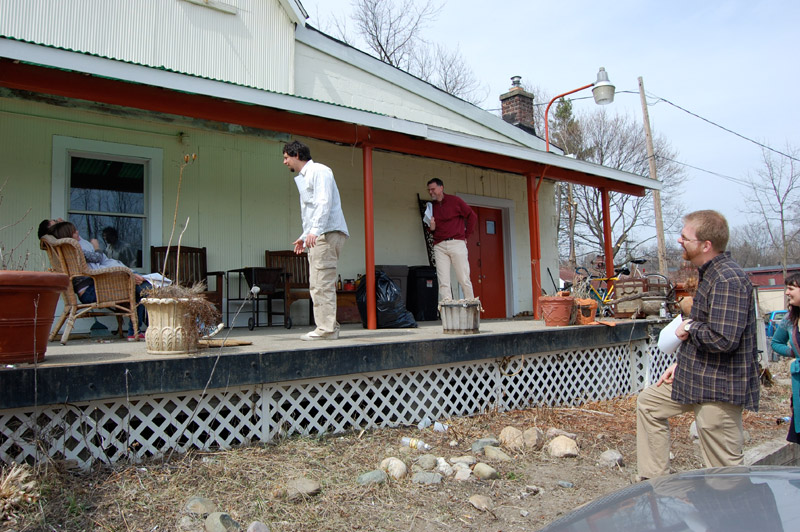 And we were off! The writers went home to write their plays, and were instructed to email them to me by 8:30 Saturday morning. (And, indeed, one play was “delivered” to my inbox at 8:24am.) At 8:30, plays were run off and photocopied. Everyone convened at the Yellow Barn at nine. And thus began our crazy and exciting day of rehearsing, designing, costuming, and basically creating three short plays.