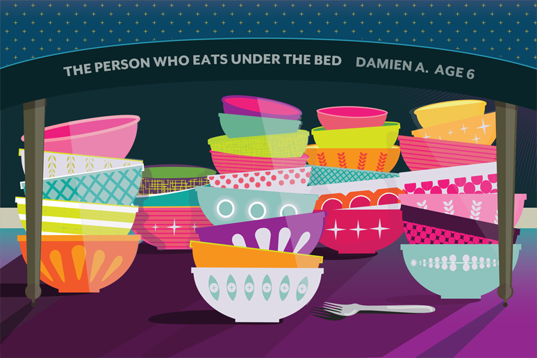 My favorite food is jambalaya with chicken and I eat it under my brother’s bed! I eat it with a fork. I eat the whole bowl. It is good. I went to get all the bowls in the kitchen and in the bathroom. I found thirty bowls in all. I filled all the bowls up. I brought them back under the bed again. I ate them all. When I was done I put all the bowls back.