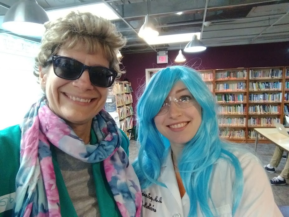 Jean’s thoughtfulness when it comes to our programs shines through in all of her interactions with 826michigan. She has volunteered to come in extra days to help finish typing student work from our field trips program and other programs for publication, and she is always eager to discuss the successes and challenges of a session with other volunteers and staff after each field trip. She made the brilliant comparison between collaborative writing and improv, helping students to cooperate and build off of each other’s ideas by applying the “Yes and” principle to storytelling (So, the teenager was in love with a coconut AND spies were chasing them through a shopping mall. . .). Jean brings her many talents for writing and performing to field trips each week, embodying any character she takes on with panache and passion (and great costumes!) and asking enthusiastic questions of our student writers. Recently, Jean doubled as Edna, a nosy documentary filmmaker trying to learn Dr. Blotch’s secrets complete with a rainbow blouse, rhinestone-studded sunglasses, and a fantastic blonde wig. Very suspicious indeed!