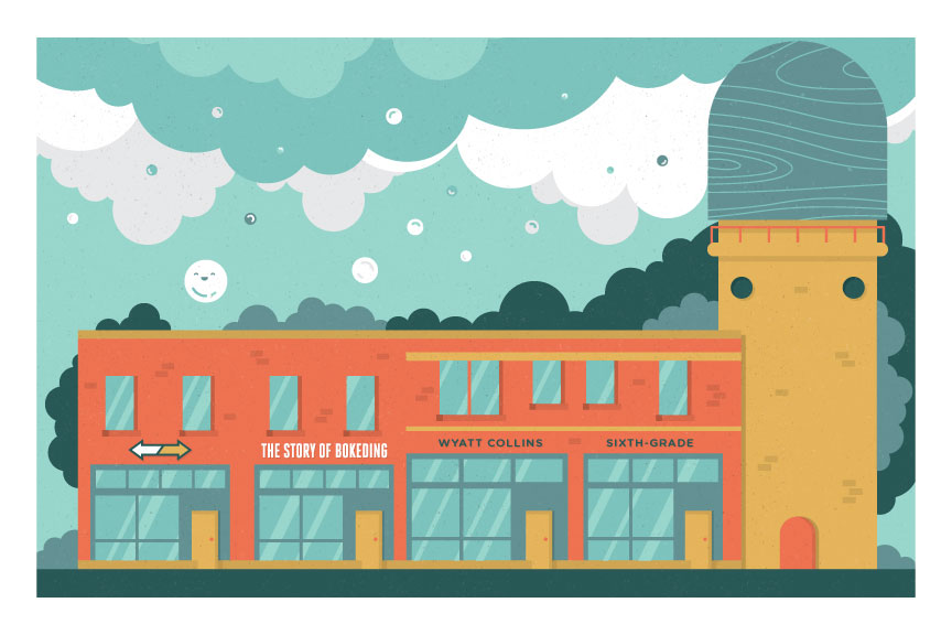 Bokeding lived for two months, which was a long time because he was a bubble. As he was floating over Ypsilanti one day, he floated too close to the ground and he froze to the ground because he got too close. Bokeding popped and had sixteen babies. They were born of four different gases. There were four Hydrogen babies, four Neon babies, four Argon babies, and four Saline babies. As Bokeding died he told the babies to live a long happy life. The sixteen babies went on to live a long happy life in the clouds over Ypsilanti.