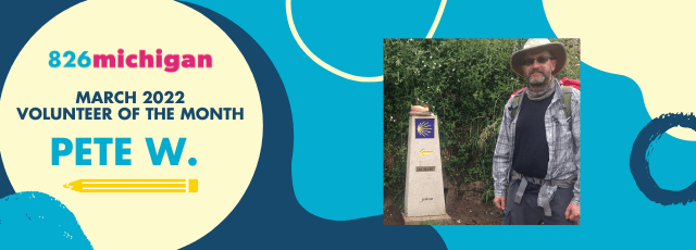 Pete has been volunteering for 826michigan since 2016 and he’s been a huge supporter of tutoring, the program we’ve renamed Virtual Schoolwork Support, since then. As an experienced volunteer, he’s been a leader for us! We can pair him with new volunteers so he can show them how to do things. One way that Pete breaks the ice with students is by making the background of his zoom a conversation starter by using different backgrounds from places he has traveled. His favorite 826michigan memory is actually a video shoutout from students from a couple of years ago, and the students highlighted some things we all love about partnering with Pete: he is engaging and friendly AND he knows how to support the students in taking care of business and tackling their homework.