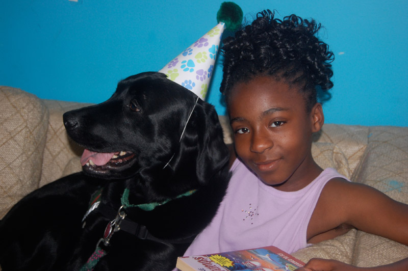 That’s right, that dog is wearing a party hat. And YES, it’s because our Volunteer of the Month, Colby, celebrated her sixth birthday yesterday. We came equipped with paw-print party hats, paw-print plates, and a whole bunch of cupcakes. Which, oddly enough, disappeared while the students were upstairs reading to the birthday girl. We found them here: