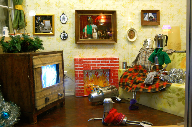 My friends: We were here late last night doing something we could not be more proud of. Have you met the Gearbots? Their living room is located in the front window of the Liberty Street Robot Supply & Repair. They are a robot family from the 1950s watching what we have determined is the robot version of the holiday classic It’s a Wonderful Life. (You’ll have to stop by to find out what that is.) Have you heard about the Main Street Area Association’s Window Display Contest? It is our hope that the Gearbots win, and you can help.