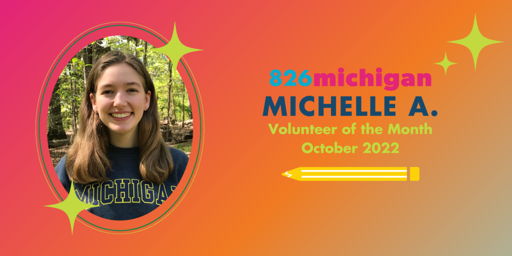 I have loved volunteering at After-school Writing Lab and the summer Writer’s Clubs. I used to love creative writing in middle school, and working with students to develop their imaginative ideas into stories helped rekindle my own imagination and appreciation for writing and storytelling. Volunteering in the store has also allowed me to connect with so many community members and educators and talk about the work 826michigan does.