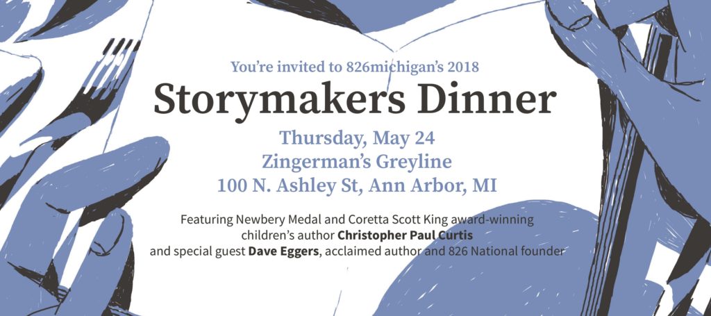 Tickets are available at two levels: $125 (dinner) and $250 (VIP reception and dinner). VIP tickets include a pre-event reception with Christopher Paul Curtis and Dave Eggers, along with 826michigan’s new executive director Naimah Wade. For more information and to order tickets, click here or email Nancy@826michigan.org.