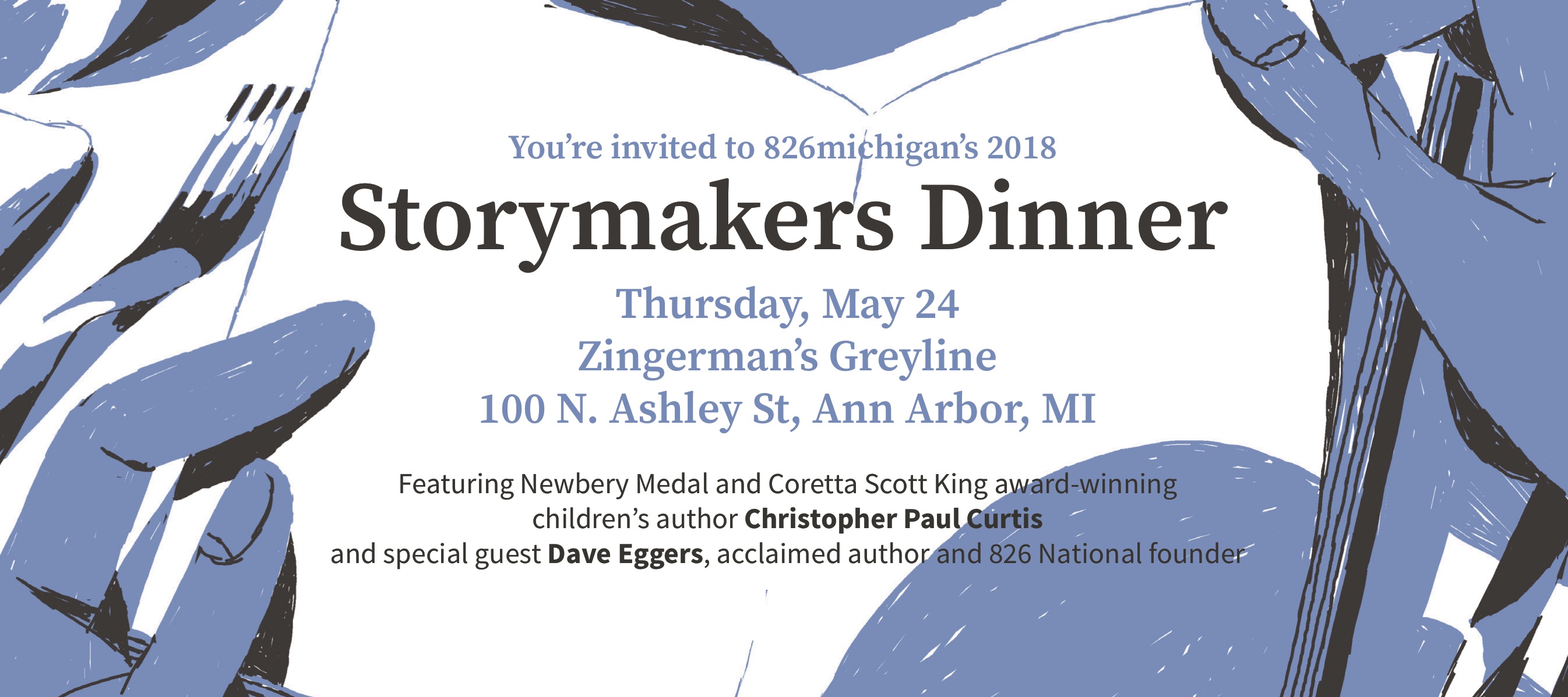 STORYMAKERS DINNER is a celebration that honors important writers and their stories, from nationally known novelists to emerging young authors in our community. Each spring, 826michigan partners with Zingerman’s Community of Businesses to bring together a noted person of letters and more than one hundred friends committed to 826michigan’s and our students’ success. We promise to provide outstanding food and drink alongside extraordinary stories.