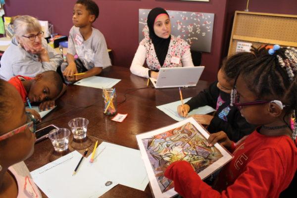 A woman in a hijab helps a group of children look at and write about a colorful abstract work of art