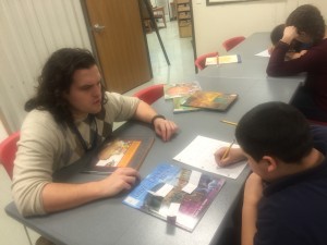 There are two new faces in the crowd, but 826michigan cultivates a space in which there are no true strangers here. Program Coordinator Brandan Pierce ably takes lead and settles everyone in with the night’s reading and inspiration for the coming stories. Sebastian Meschenmoser’s Mr. Squirrel and the Moon is the starting point for what’s to come. This Wednesday, students are challenged to craft tales that seamlessly pair two completely (or so it seems) unrelated subjects. Tigers and NASA? Kings and gardens? How will the students make this work?