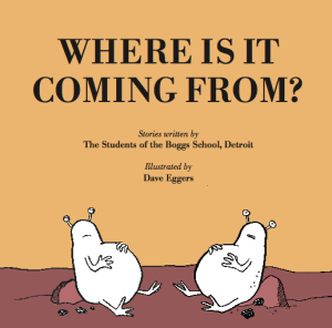 Where Is It Coming From? is a heartwarming and hilarious collection of stories written by elementary students at Detroit’s Boggs School, where we run an after-school writing club. It came about serendipitously, after Dave’s participation in kindergarten storytime during his visit to the Boggs School in May 2014. Students in 826michigan’s after-school writing club led storytime with the reading of their pieces for Dave’s visit and their work astounded everyone in the room. To the students’ delight, Dave insisted upon getting print-outs of their work so that he could read the stories to his children at home in California. Inspired by the joy that the work of the Boggs School students spread in his family and the purely original ideas of these remarkable students, Dave decided to get to work on making the stories available to a wider audience. Where Is It Coming From? pairs brash and funny stories written by the 6 to 10 year old members of 826michigan’s writing club with equally anarchic illustrations by Dave Eggers. The book is as sweet and engaging as the students themselves.